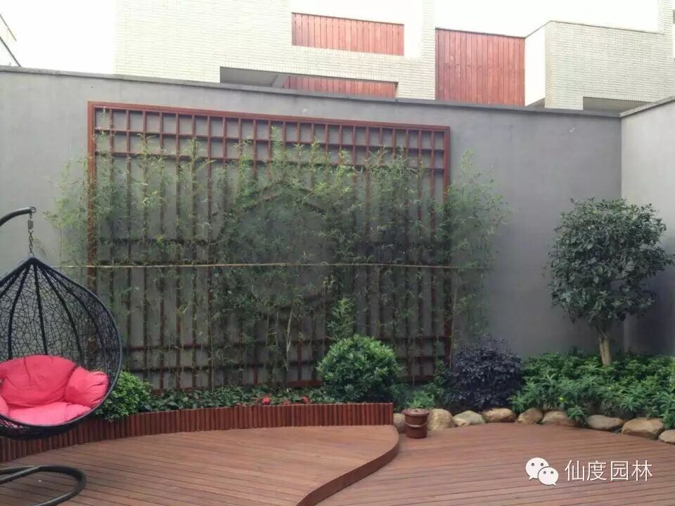 那几株造型树刚植下不久,所有的枝杆漫散开来,已经迎着朝阳向主人诉说未来了,浓郁的树叶汇成绿色的汪洋,溢满整个院落的空际,阳光也只得在这绿色的汪洋中游戈,偶尔在轻风拂过的间隙逃逸出那么几束,若天使般绽在爬山虎的绿网上,绽在青草叶片上,绽在那娇柔细嫩的花瓣上了。 区域化的木栅栏恰到好处的把院中的乔木种植在它们的辖区内,柔柔地向着阳光,它们与花枝、爬山虎和睦相处,却又不失优雅的界限。中式的轩窗与竹幕墙营造一种温婉大气、恬淡清宁的典雅气质,从内到外仿若一幅古老画卷,展现出庭院主人对华夏文化的一份向往和迷恋。