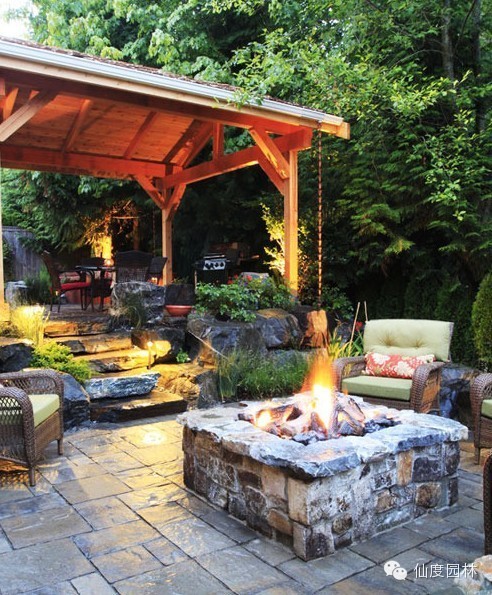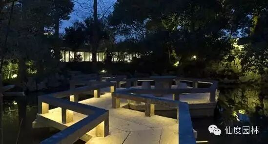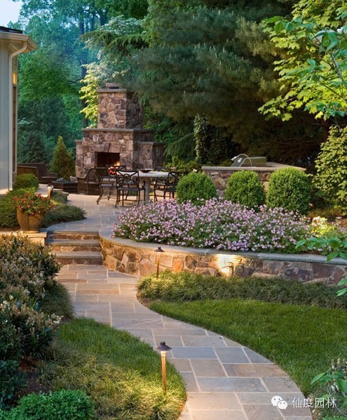 园灯是花园夜色的灵魂,除了满足照明外,还有安全上的作用,如水池边缘的提醒。灯光镶嵌在石栏的底部,灯光透过地面的照应,不仅起到美化环境气氛调节,让花园更添神秘感。